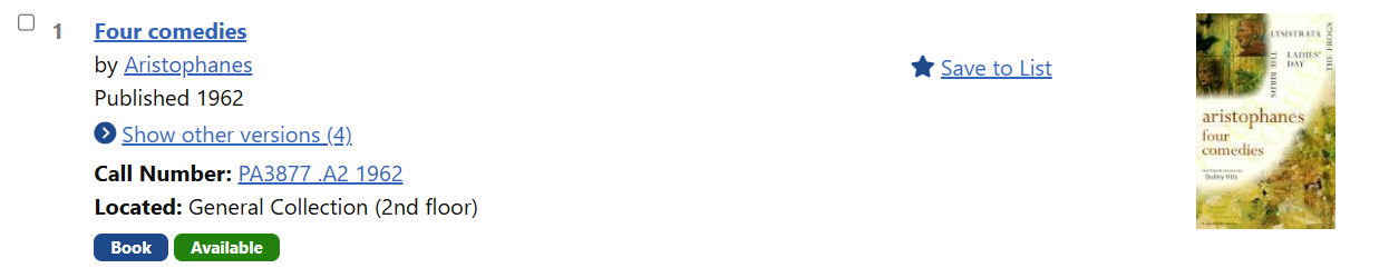 To find an item in the library, start by searching our catalog and making note of the item's call number and location. If you were looking for Four Comedies by Aristophanes, this is what you would see in our catalog: